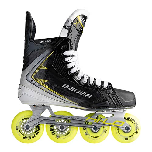 Der Bauer Inliner Vapor Fly40 Roller Hockey Skate Senior ist ein Rollerhockey-Inlineskate für Spieler, die ein performance-orientiertes Setup für Training und Spiel suchen. Beim BAUER Vapor FLY40 bietet das 3D Curv Composite Außenmaterial eine gute Kraftübertragung bei gleichzeitig angenehmer Flexibilität. In Kombination mit der TPU Außensohle entsteht ein stabiles, langlebiges Setup für Training und Spiel. Das atmungsaktive, sublimierte Innenmaterial sorgt für ein angenehmes Fußklima und hohen Tragekomfort. Die Pro Stock Zunge aus 40oz Filz unterstützt Komfort und Schutz.