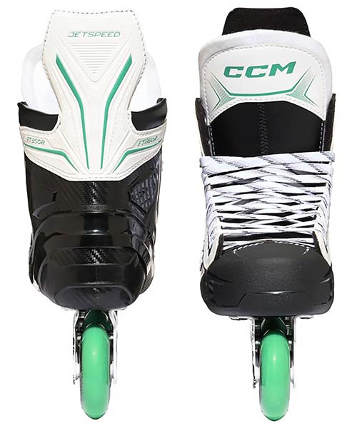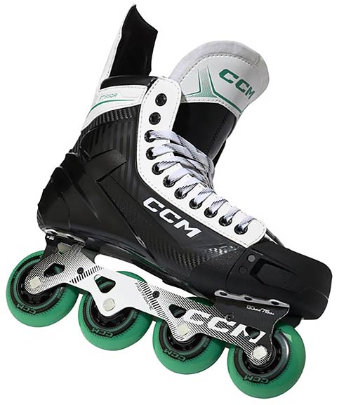 Für die Rolleigenschaften setzt der Skate auf ein zweiteiliges Hi-Lo Stahl-Chassis, das auf Balance und Wendigkeit ausgelegt ist. Die CCM Roller Wheels sind in einem gestaffelten Setup montiert: kleinere Rollen unterstützen schnelle Richtungswechsel, größere Rollen erhöhen die Geschwindigkeit. Mit 82A Härtegrad sind die Rollen auf Haltbarkeit und ausgewogenen Grip für verschiedene Untergründe ausgelegt. Abec 5 Kugellager runden das Setup mit einem gleichmäßigen Rollverhalten für Training und Freizeitspiele ab.